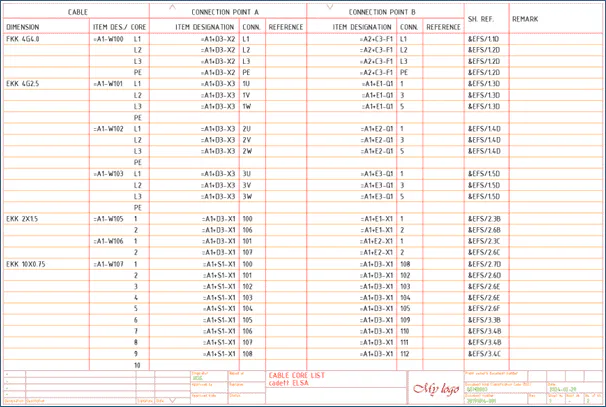 Blockschemamodulen i cadett ELSA Enterprise innehåller funktioner med avancerade regelverk för artikelstrukturer med exempelvis skåp som kombineras till en hel anläggning. Blockschemat kan innehålla information om alla kablar, parter och anslutningsmöjligheter.